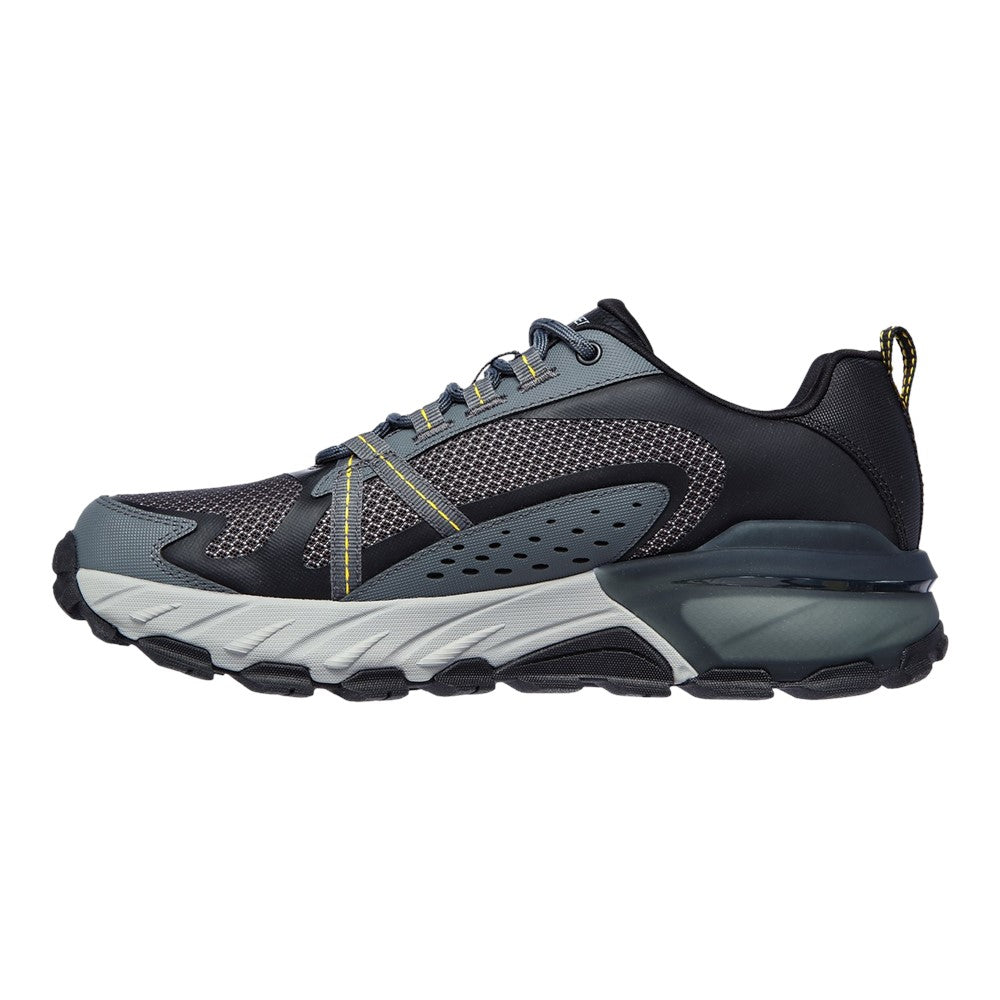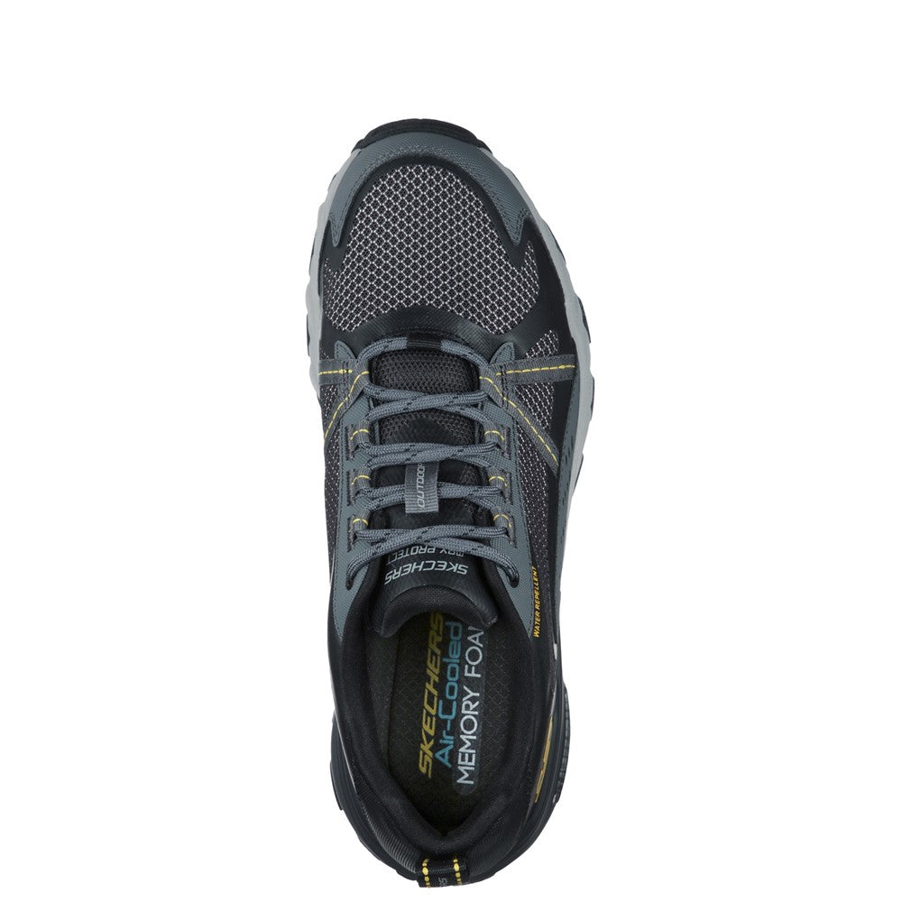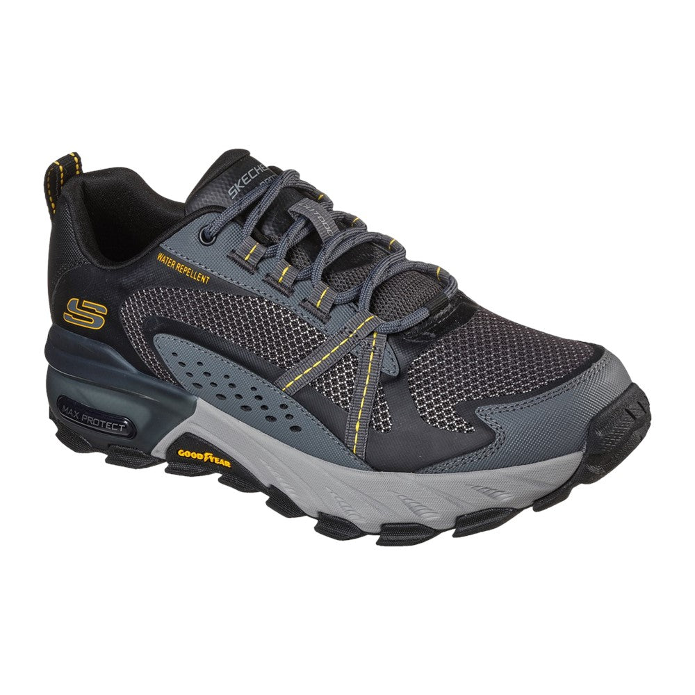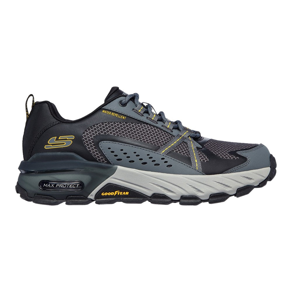 Stride through the day with durable comfort in the Skechers Max Protect shoe. This lace-up sneaker features a water repellent leather and mesh upper, Air-Cooled Memory Foam insole and a Goodyear performance outsole.
