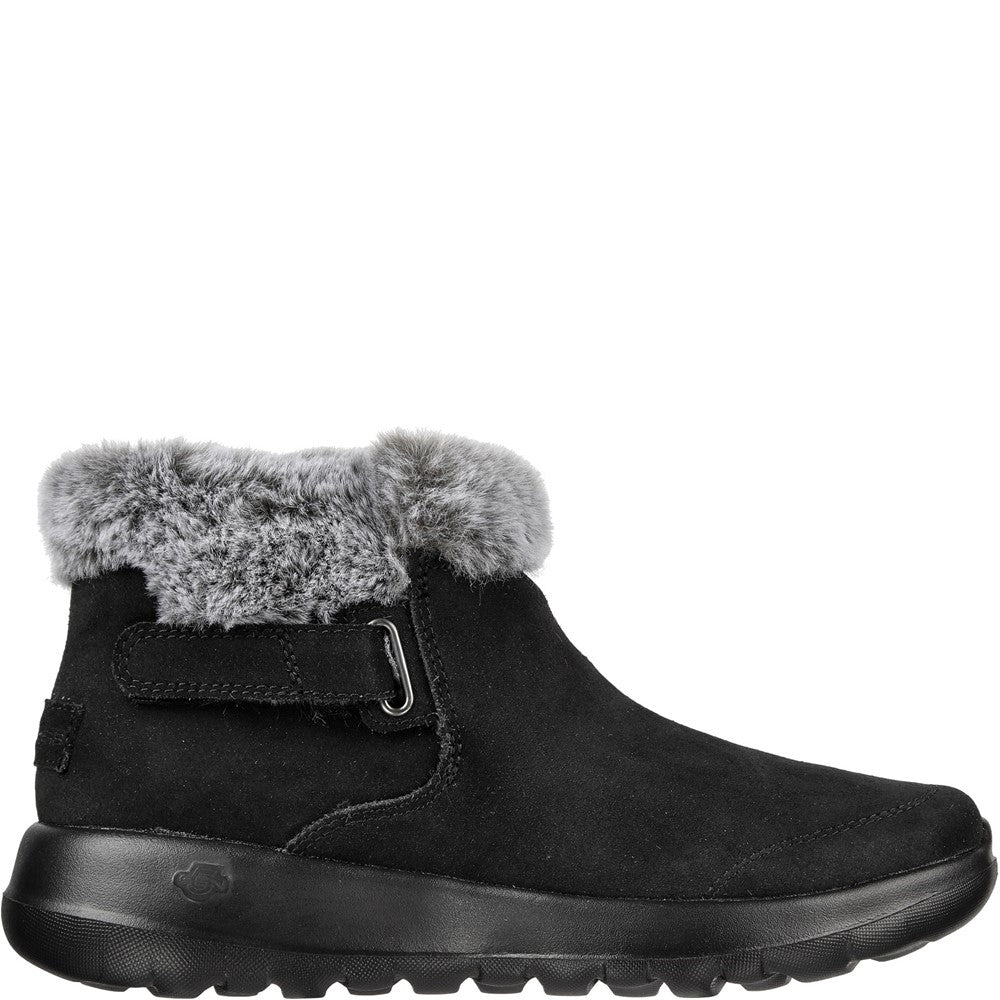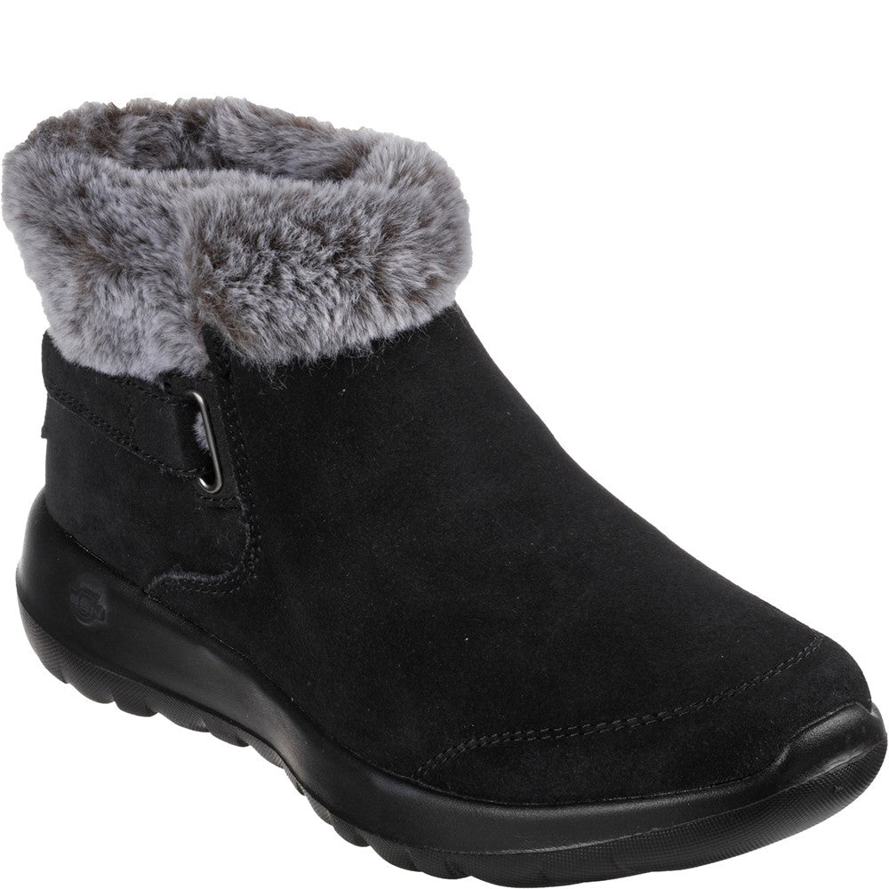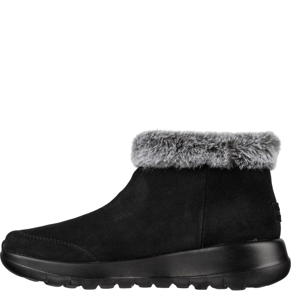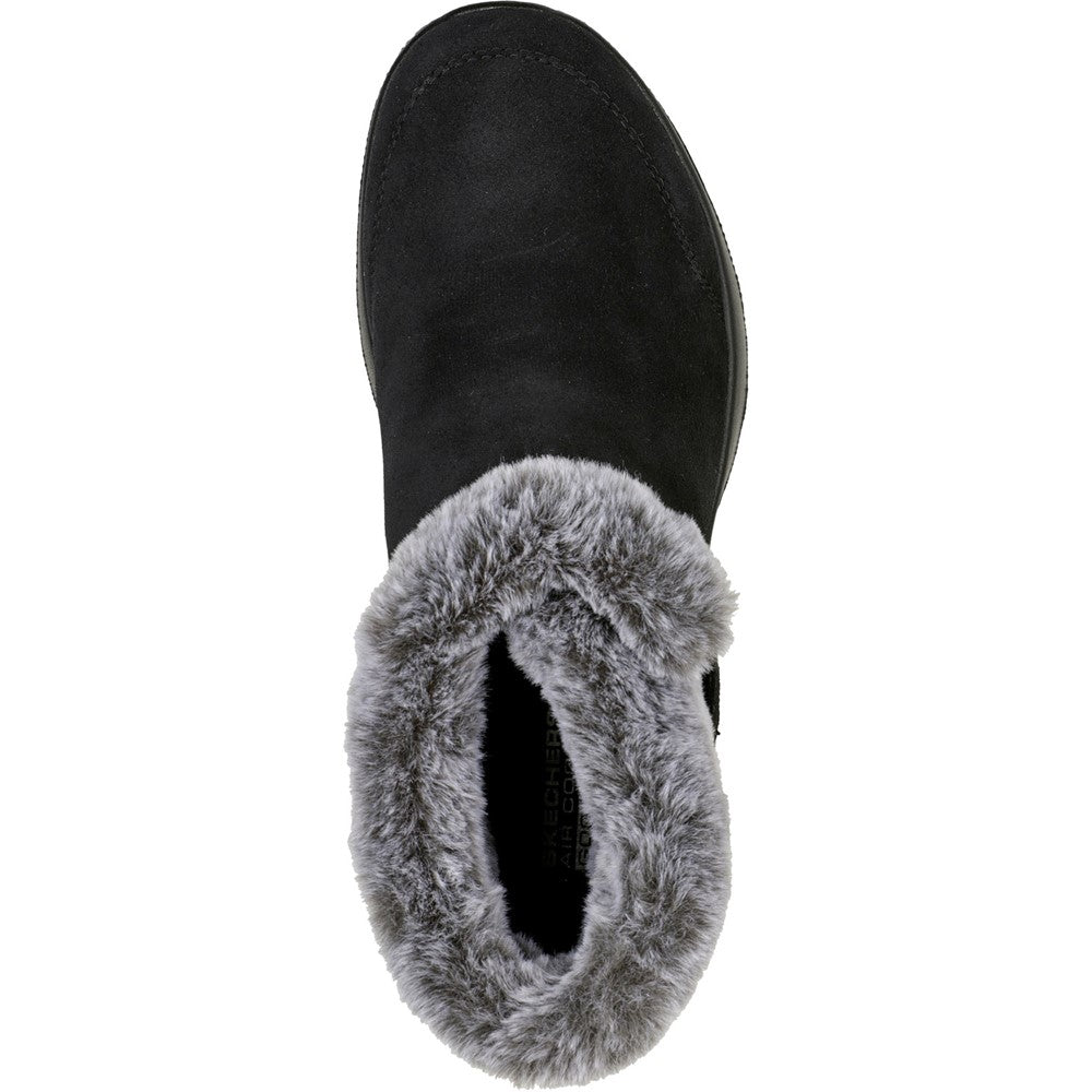 Enjoy the season in plush comfort with Skechers On-the-GO Joy First Glance. This slip-on cold-weather bootie features a 3M Scotchgard treated suede upper with a faux-fur trim and lining plus a Skechers Air-Cooled Goga Mat insole.